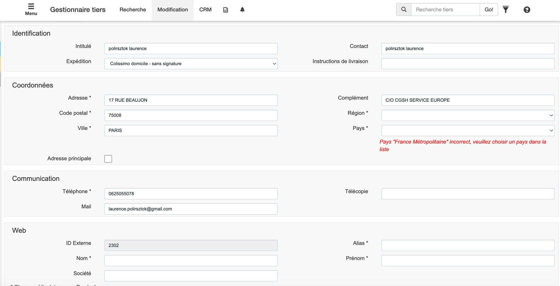Quand vous cliquez sur une adresse vous arrivez sur son détail. Vous remarquerez tout une partie INTERNET permettant de stock le nom, prénom, ID site, Alias.