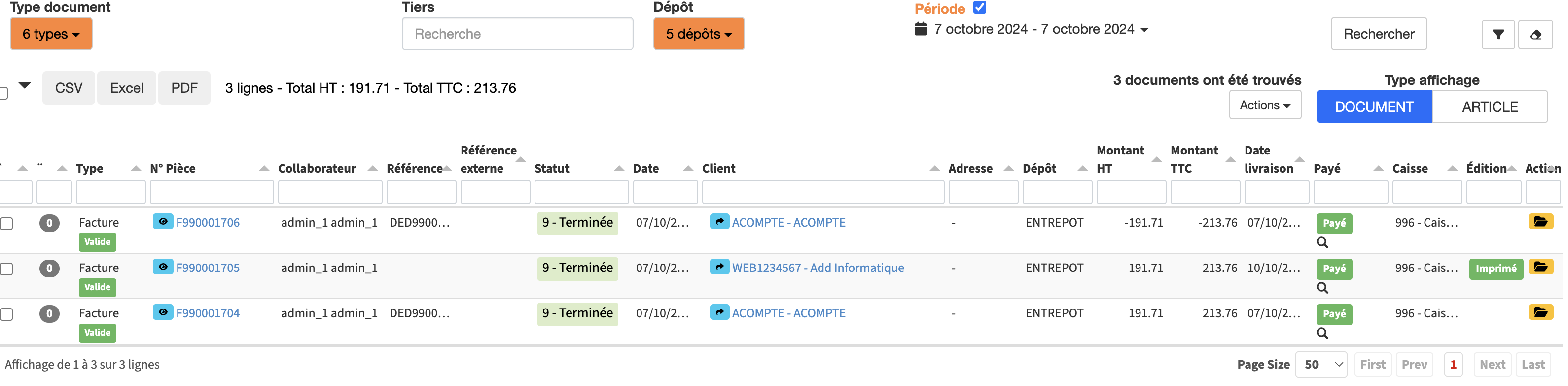 Une fois que votre facture de marchandise est validée, la contre-passation de votre facture d'acompte est générée à la date de la facture de marchandise (afin de l'annuler).