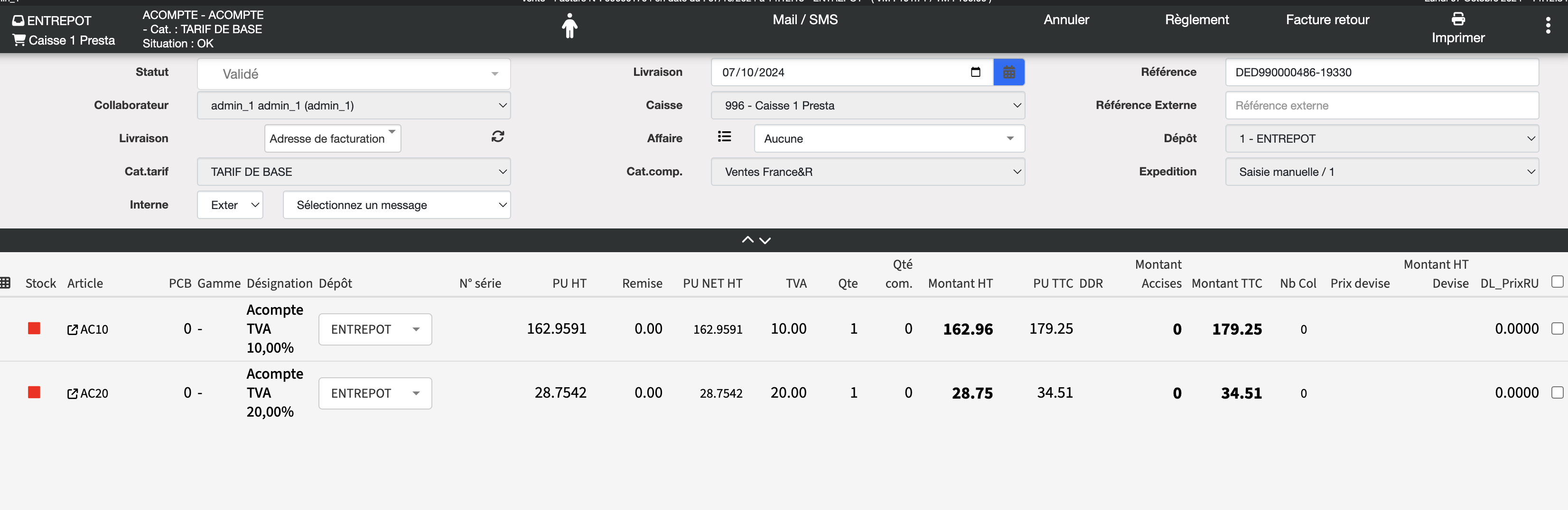 La facture d'acompte constate le paiement partiel du client avant la livraison complète, en détaillant le montant versé.