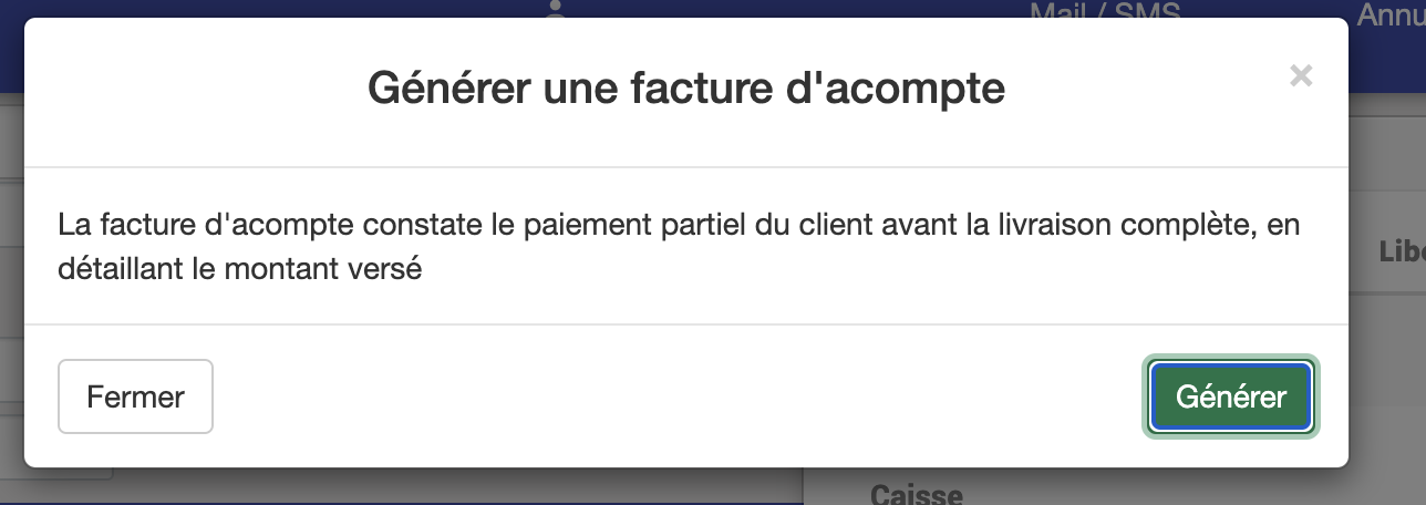 Vous pouvez ensuite générer une facture d'acompte à partir de vos Devis/Préparation de livraison/Commande sur lesquelles un acompte a eu lieu.