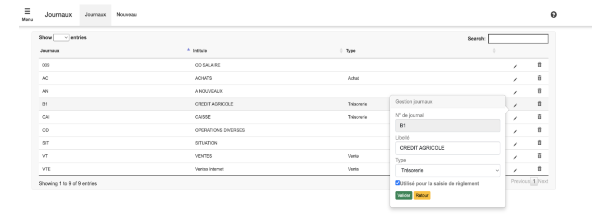 Pour la saisie des règlements en comptabilité auxiliaire ou dans un document, vous devez disposer d'au moins 1 journal de type trésorerie.