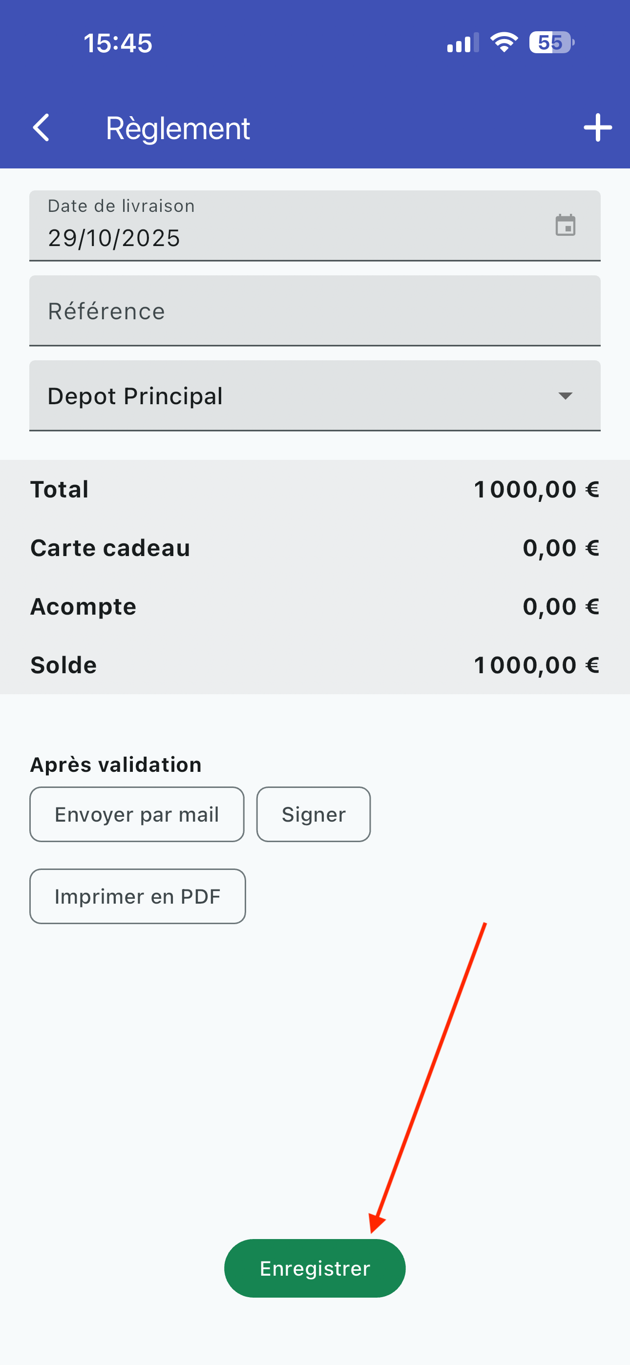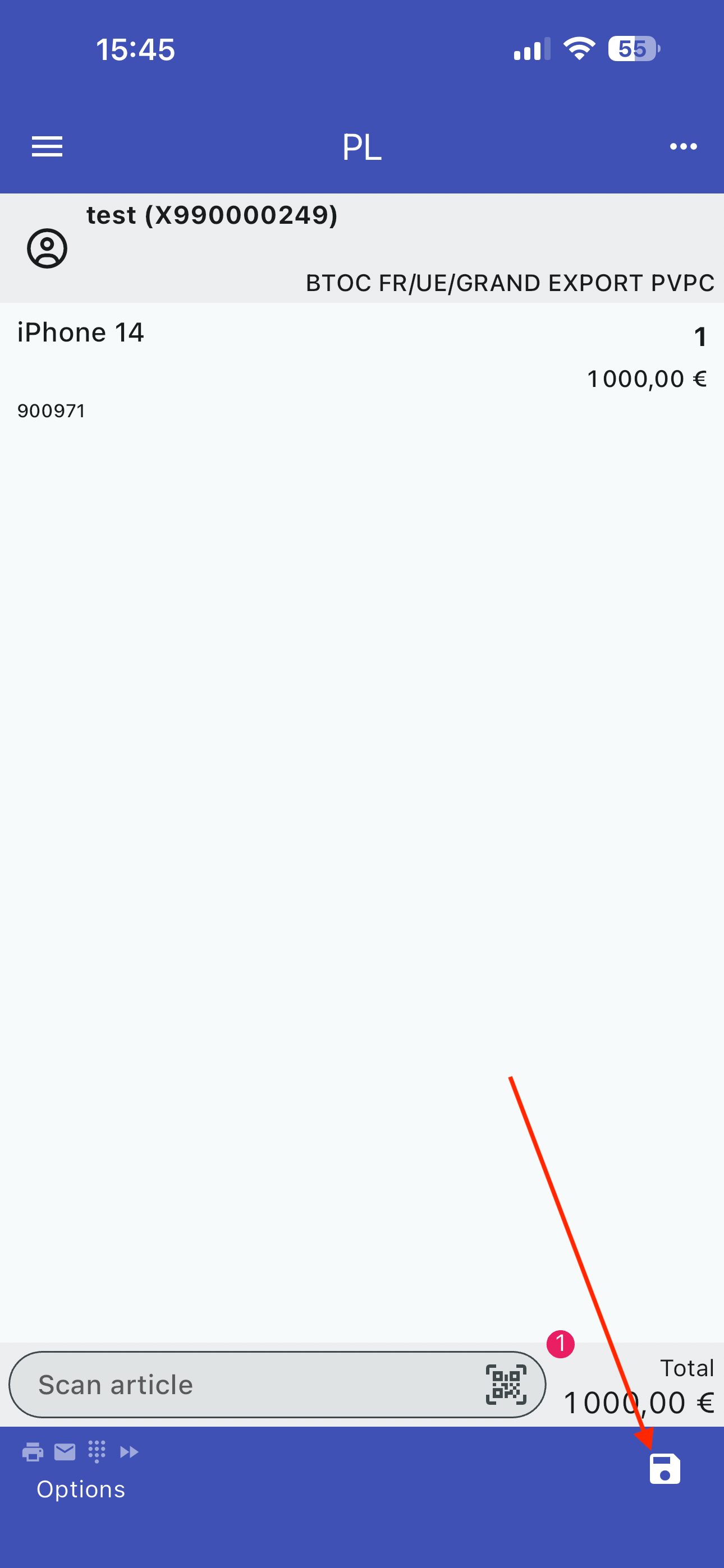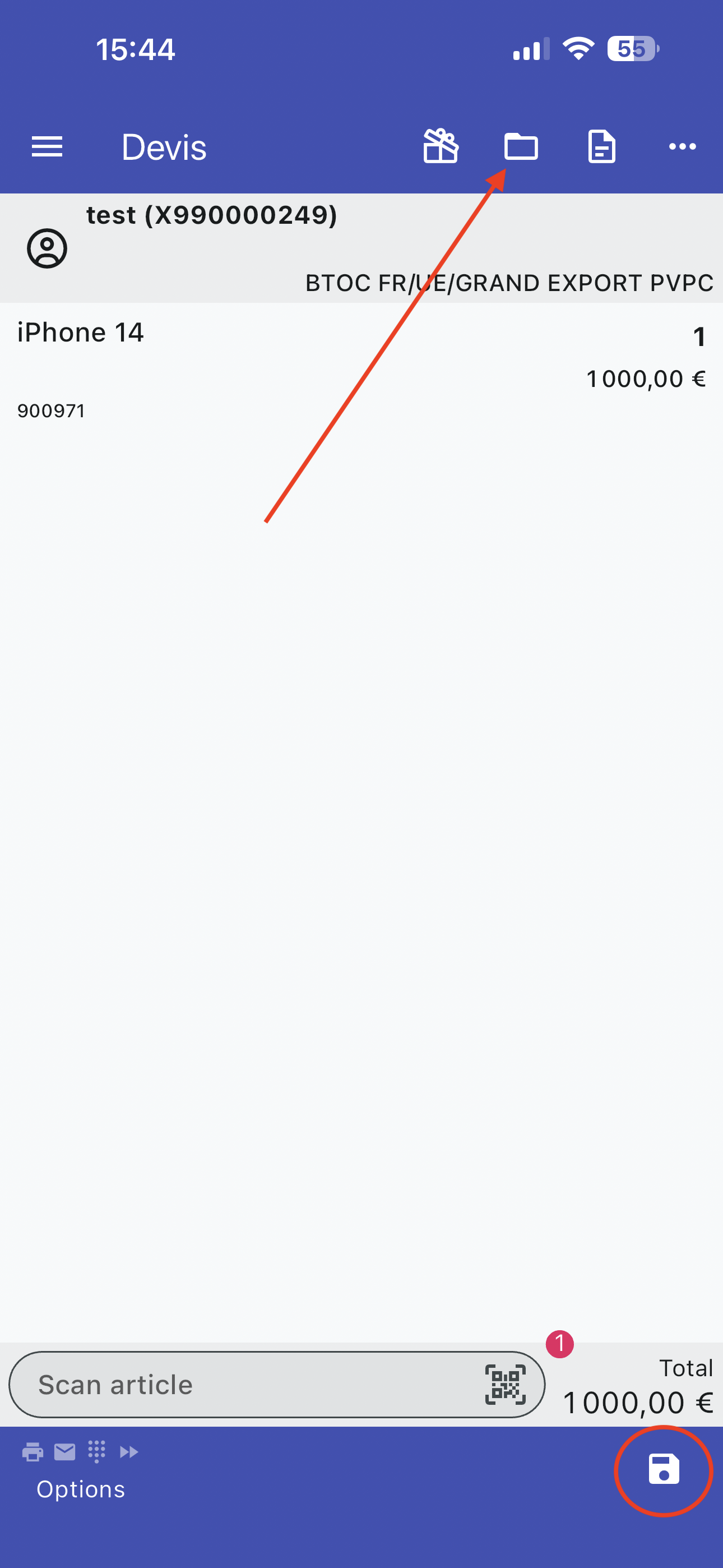 Vous pouvez ensuite valider votre document via la disquette en bas à droite de votre écran. Vous pouvez ensuite rechercher vos documents via le bouton de rappel indiqué ci-dessous par une flèche :