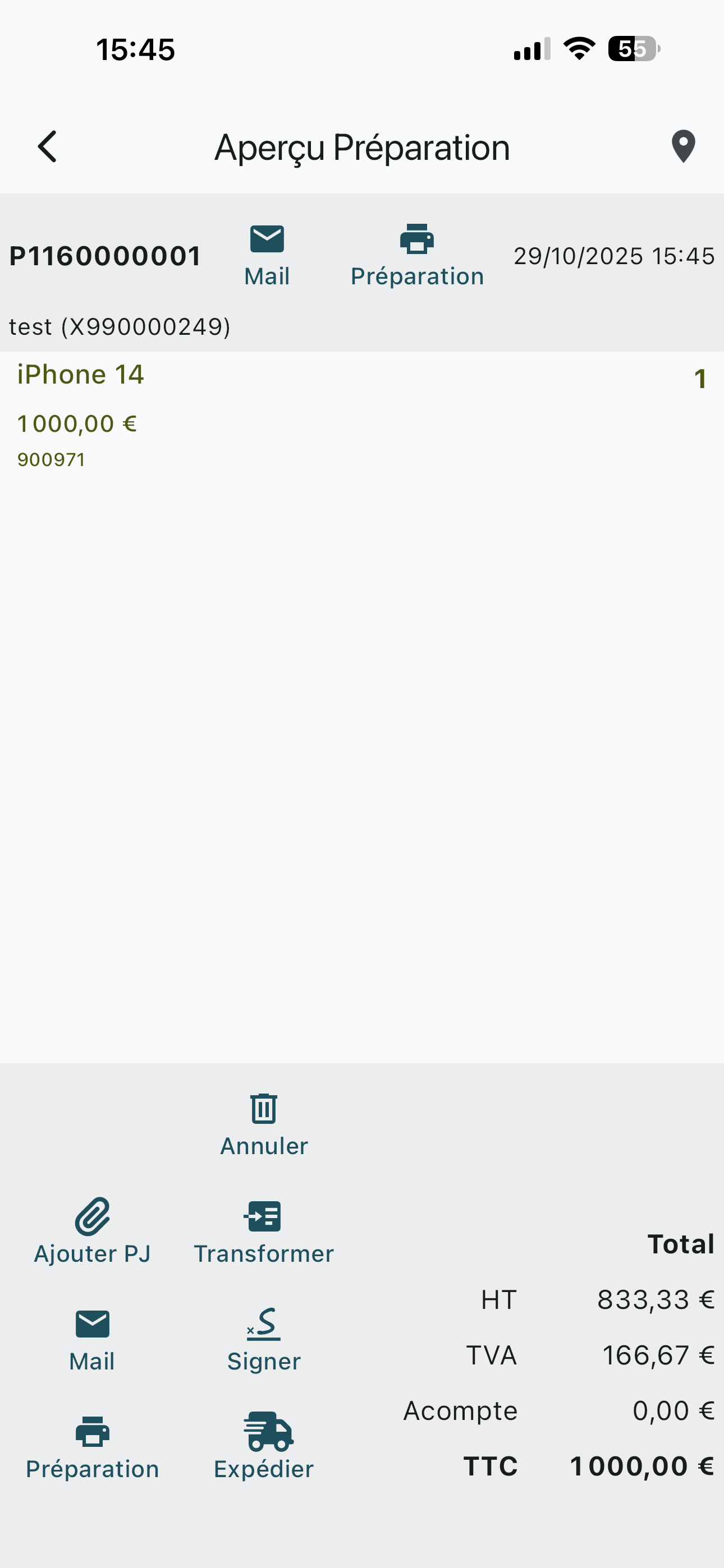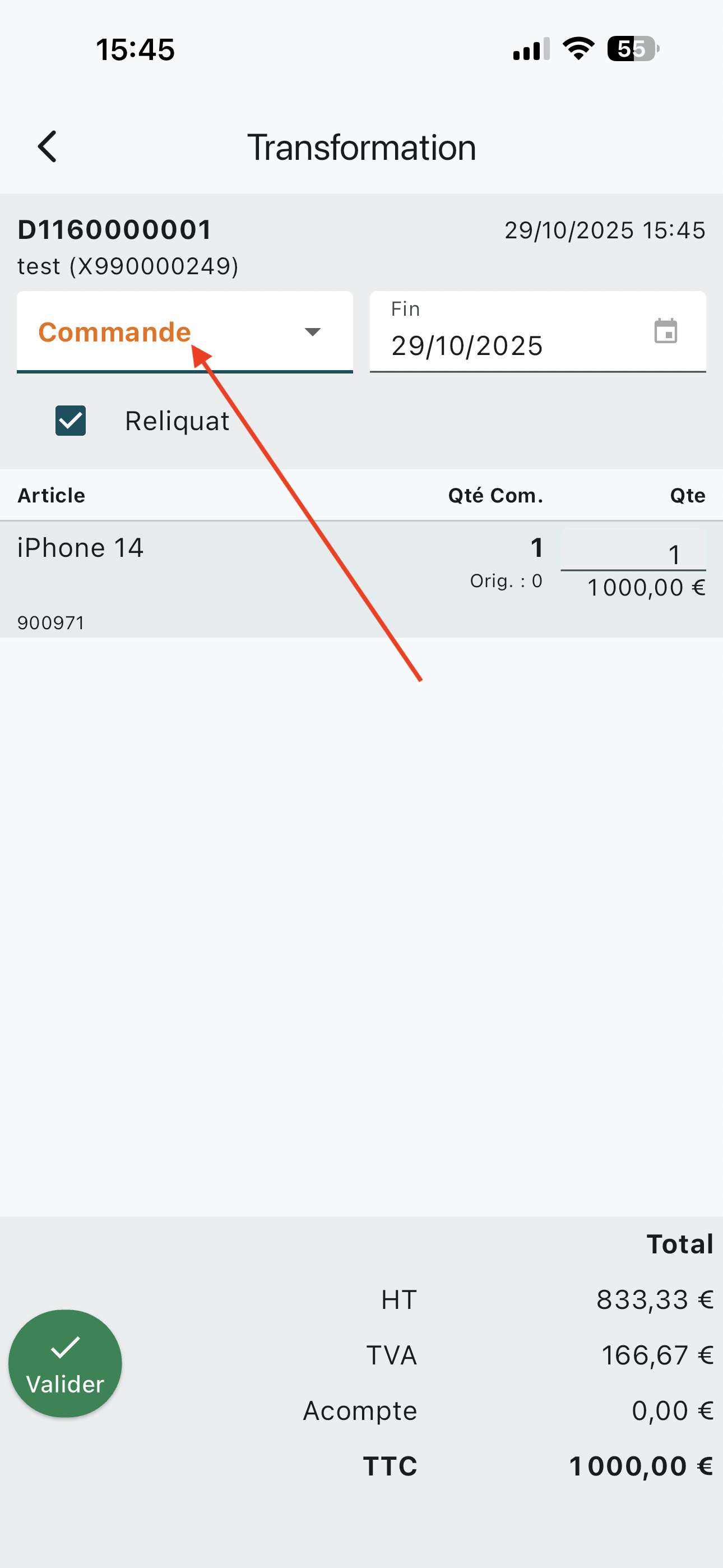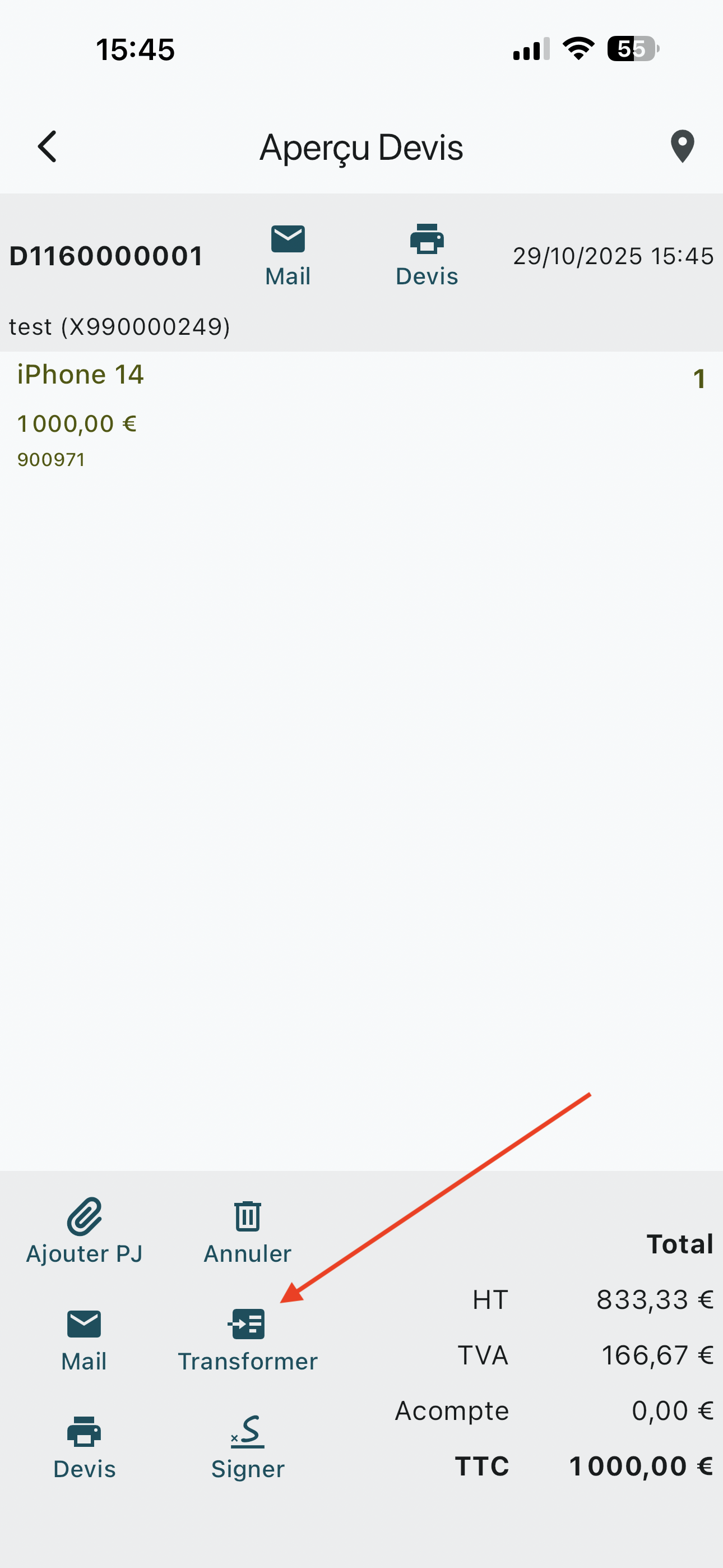 Cela vous ouvrira votre devis. Cliquez ensuite sur le bouton "transformer" :