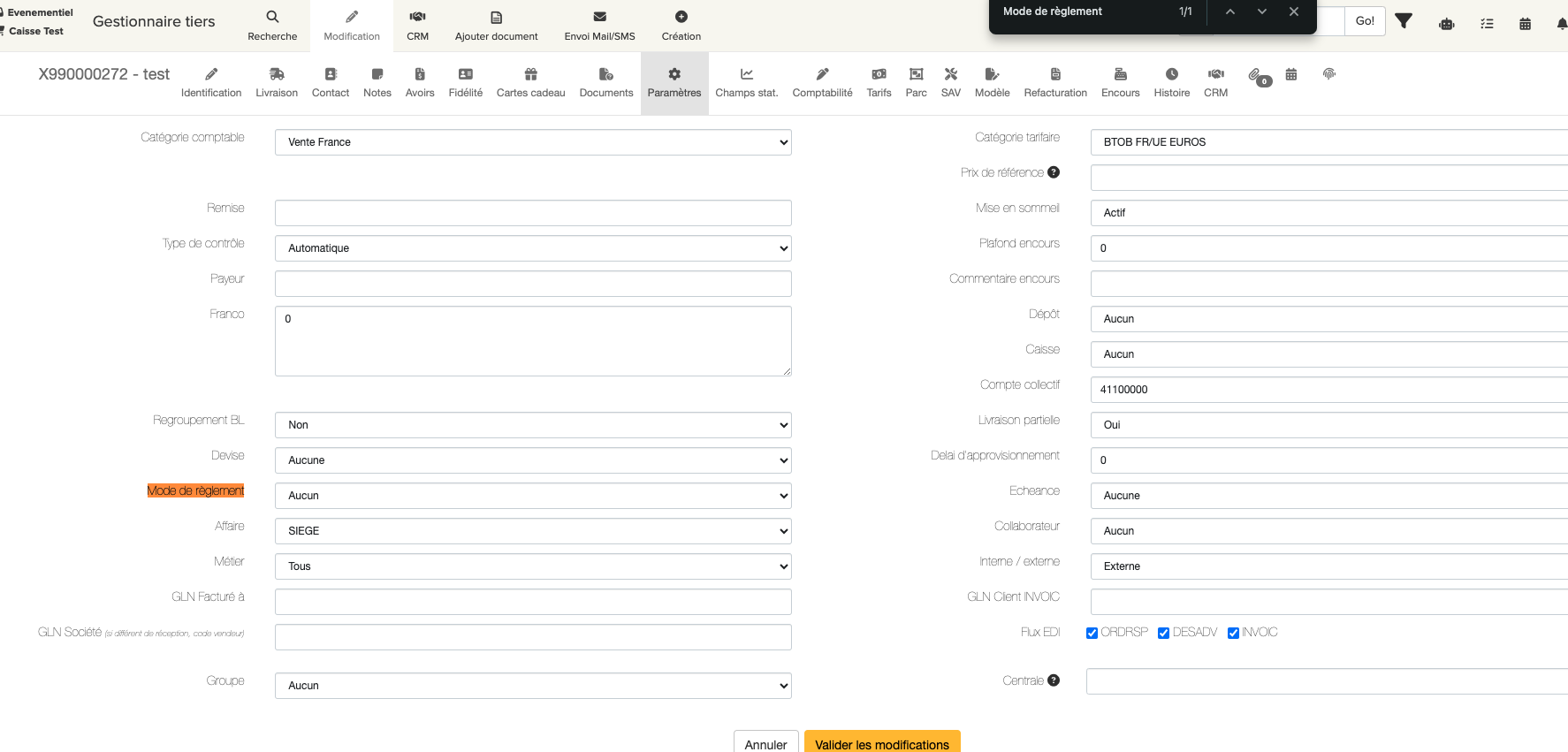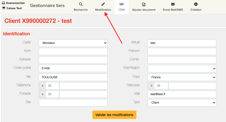 Pour cela, rendez-vous dans la fiche tiers en question, allez dans l'onglet modification :