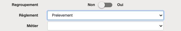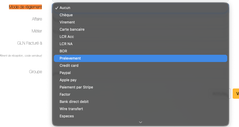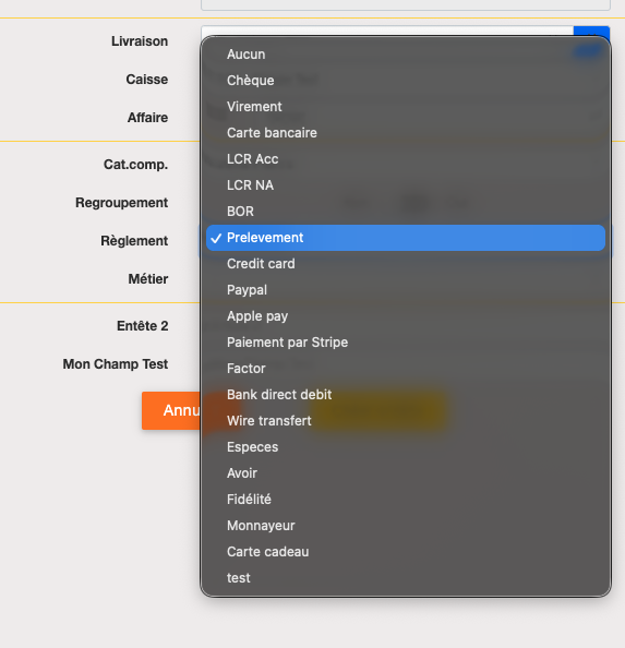 Vous pouvez alors lui attribué le mode de règlement voulu, par exemple "prélèvement" :