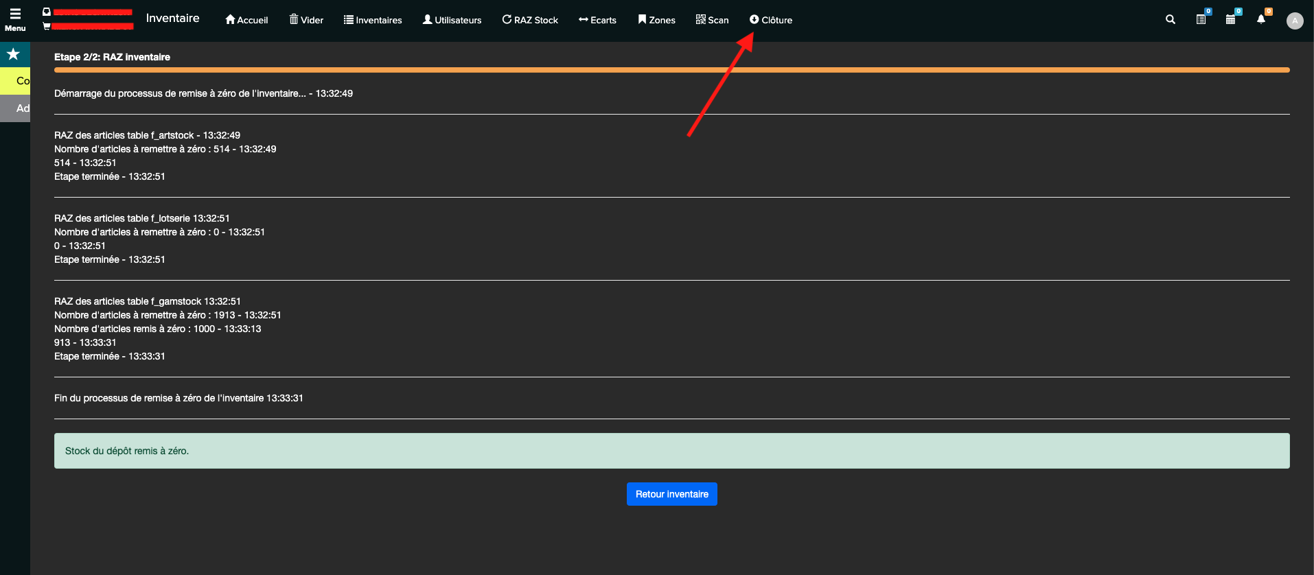 Une fois sur votre inventaire, allez sur "RAZ STOCK", faites remises à zéro de tout le stock et prise en compte des OR à non, puis cliquez sur "remise à zéro du dépôt".