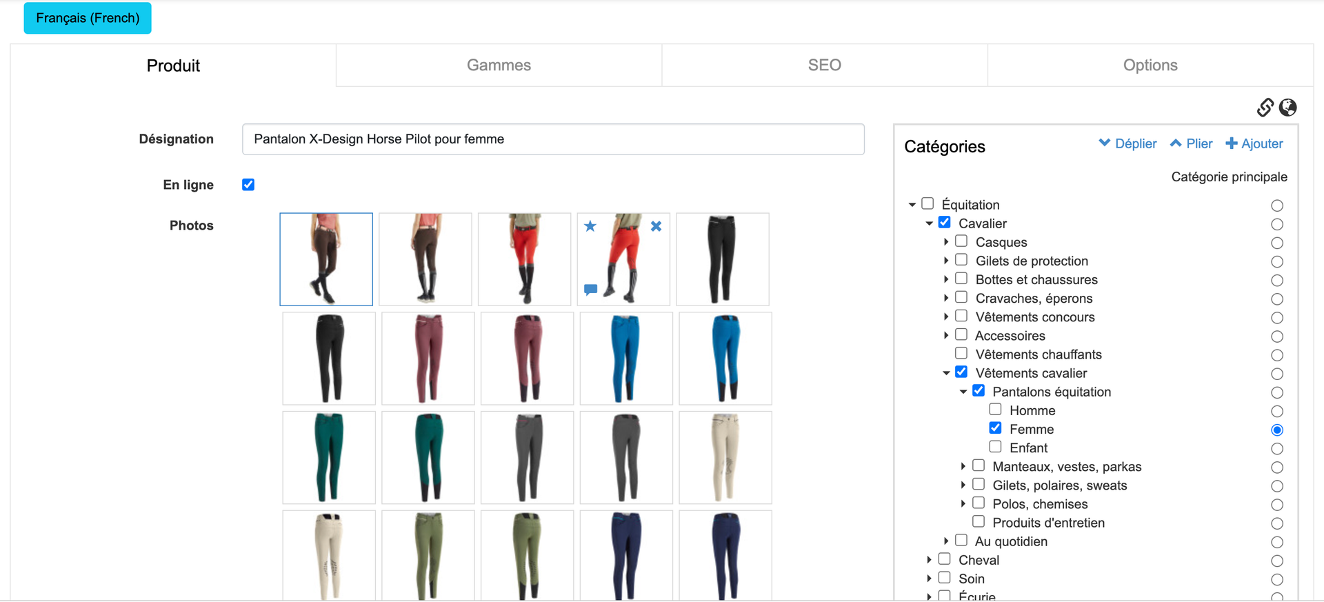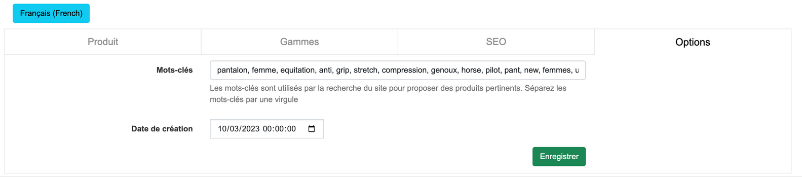 Depuis cet onglet vous pouvez directement alimenter le site internet sans avoir à ouvrir le back office de PRESTASHOP. Vous pouvez cependant ouvrir le back-office du site en cliquant sur l’icone LINK en haut à droite de la page. Si vous cliquez sur la terre vous affichez la page WEB de votre article, et pouvez ainsi directement juger de sa qualité.