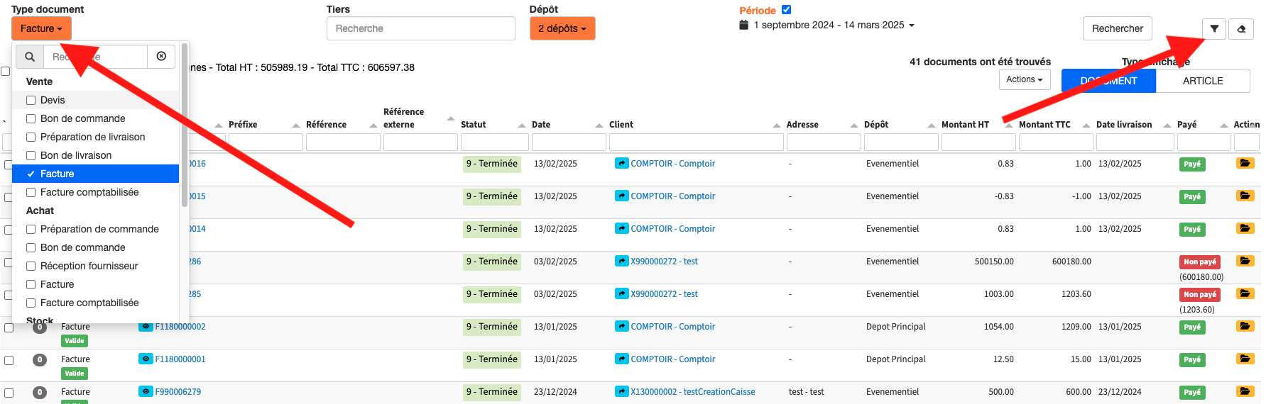 Sélectionnez le ou les types de documents souhaités, puis cliquez sur l'entonnoir en haut à droite pour ajouter des filtres :