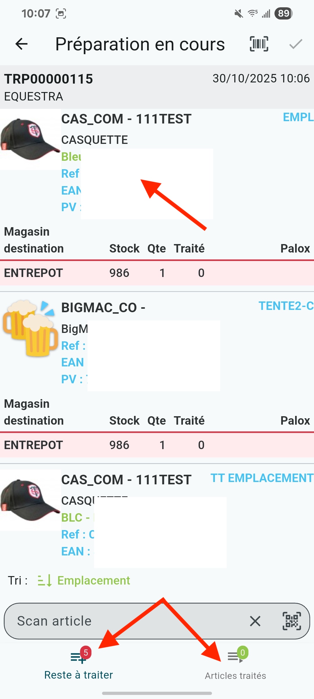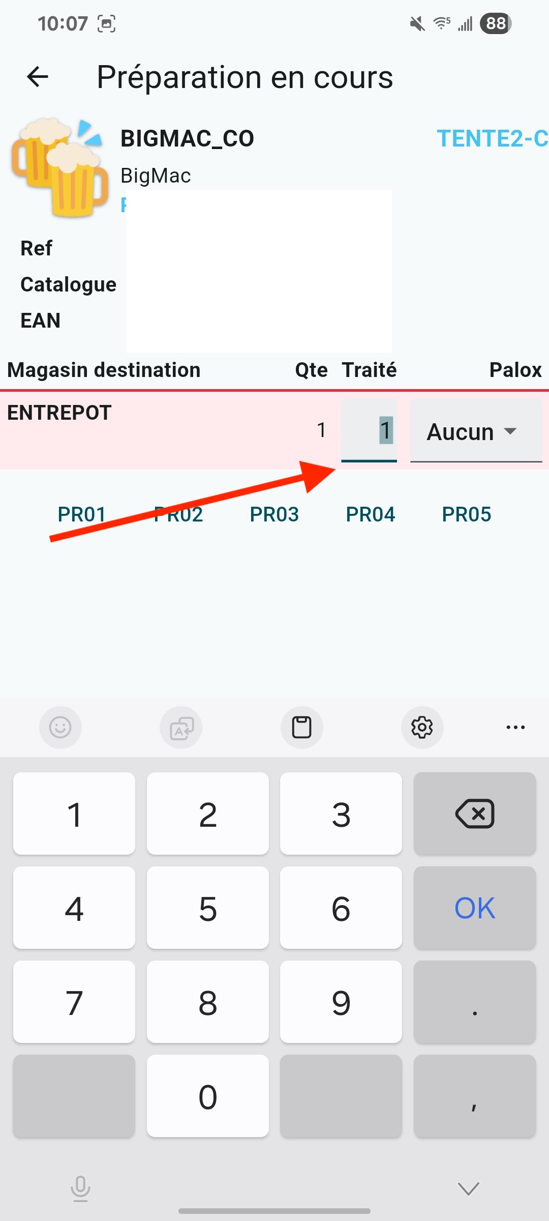 Une fois la préparation en cours, soit vous scannez l'article, soit vous cliquez sur l'article afin de renseigner la quantité traité et le palox.