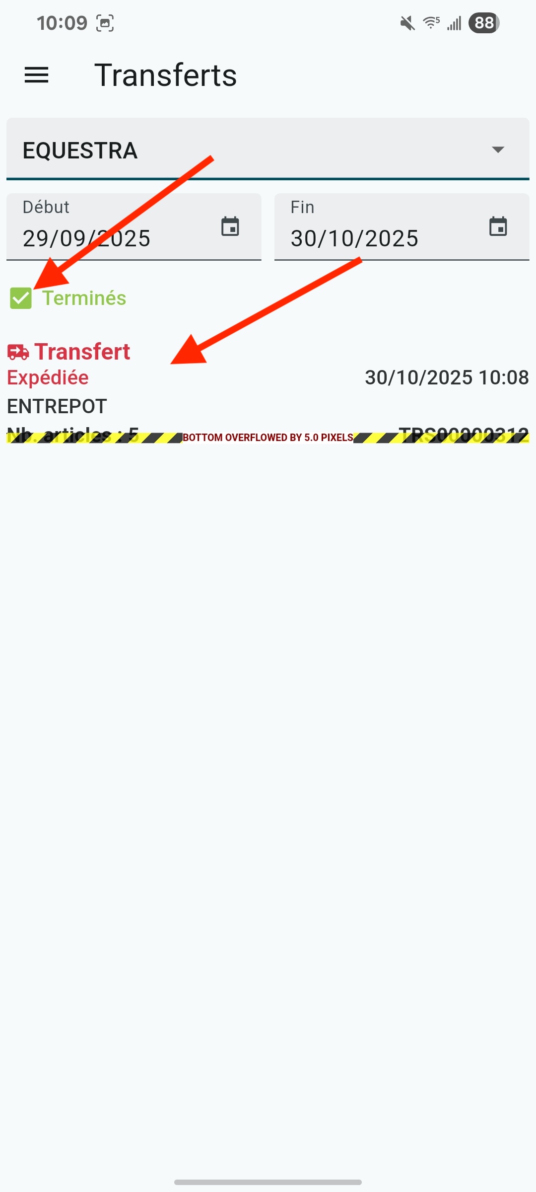 En haut à droite de l'écran , une fois tous les articles traités, une la coche devient cliquable afin de valider le transfert :