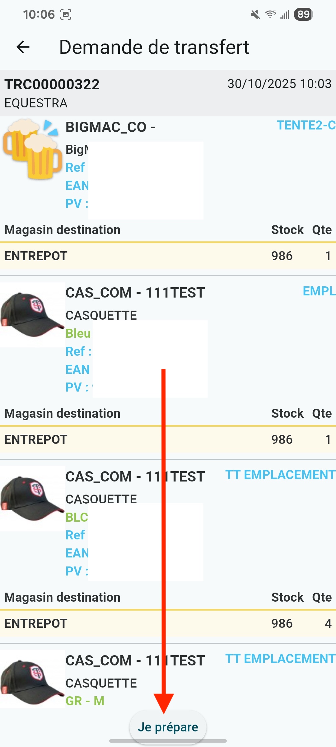 Cliquez sur votre demande de transfert pour y entrer. Vous allez ensuite voir tous vos articles, et tout en bas de l'écran un bouton 'je prépare'